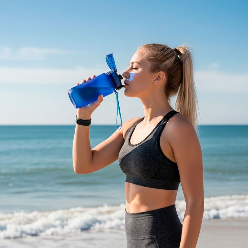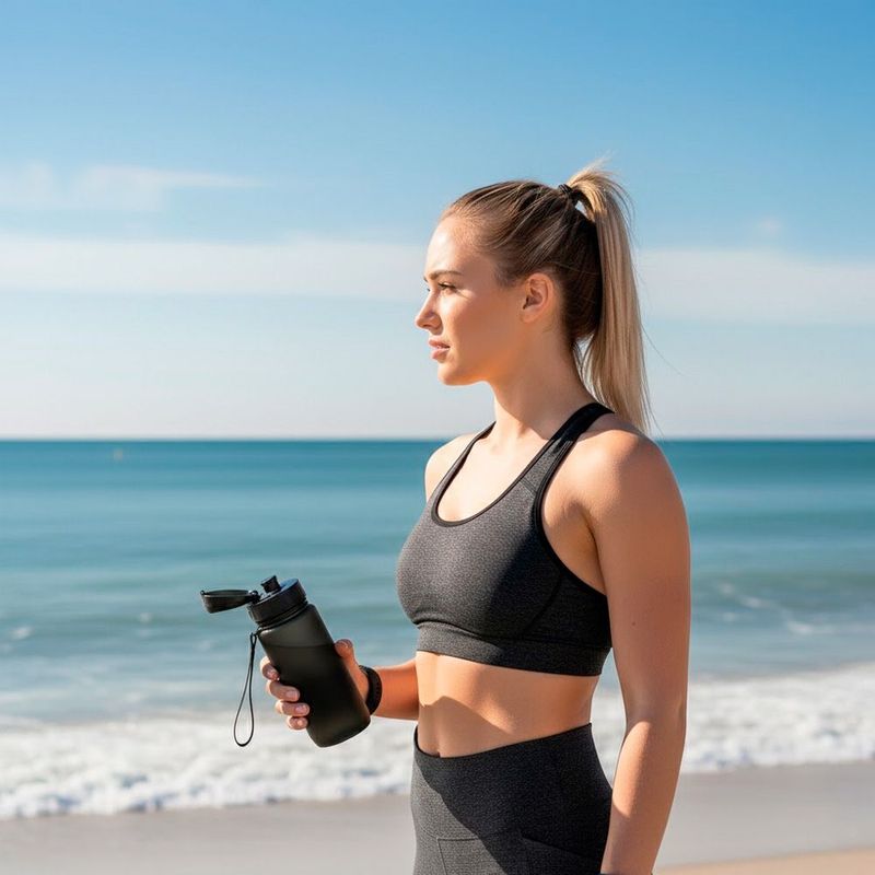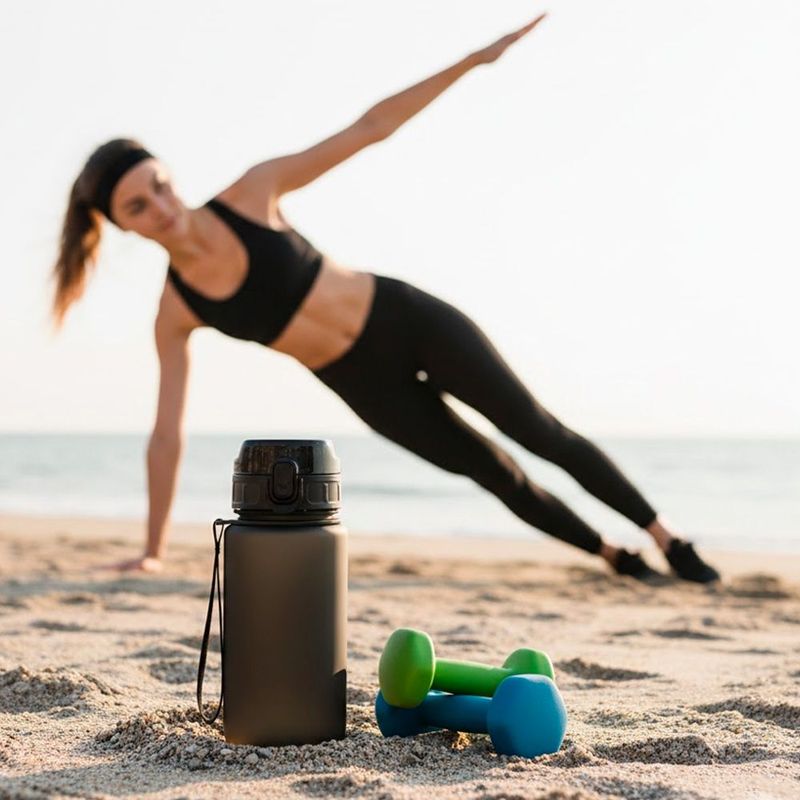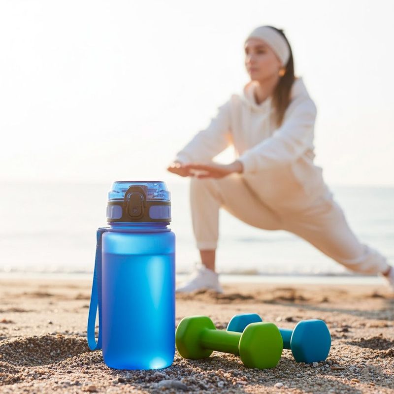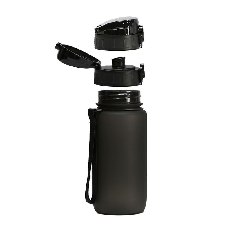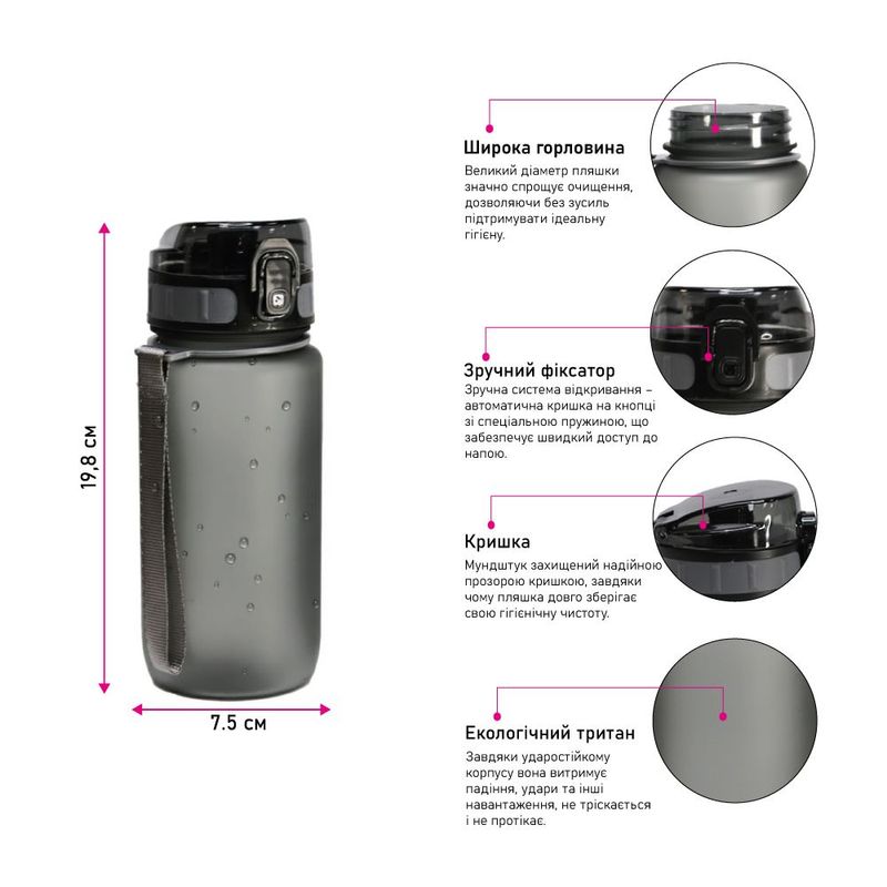 Кришка оснащена кнопкою з фіксатором, що запобігає випадковому відкриттю під час транспортування. Пластиковий носик для пиття з відкидною захисною кришкою забезпечує гігієнічність та зручність під час використання у спортзалі, офісі чи на вулиці.