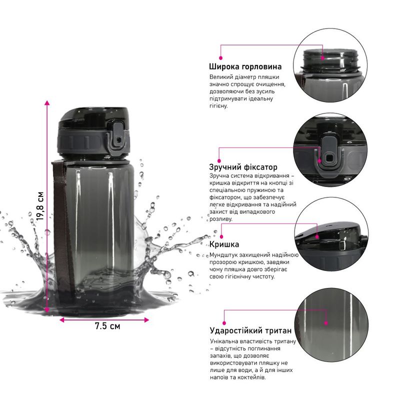 Вставки на боках кришки забезпечують комфортне відкривання навіть мокрими руками. Завдяки широкому горлечку пляшка легко миється та швидко наповнюється.