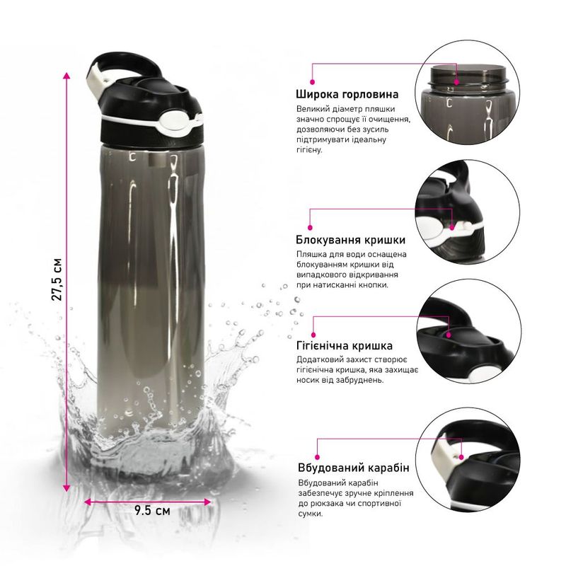 Пляшка оснащена кнопкою блокування та кришкою, що захищає силіконовий носик. Внутрішня трубочка забезпечує зручне пиття без нахилу.