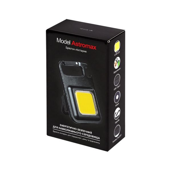 Брелок-ліхтарик Astromax, з вбудованим полімерним акумулятором з високою водостійкістю. Режими світла 4 - (100%, 50%, страбоскоп, ВИМК., довге натискання вводить суперяскравість). Має спеціальний гачок-карабін, та функцію відкривашки. Вбудований сильний магніт, розбірний кранштейн на задній стінці ліхтарика. Потіжний прожектор 6W COB.