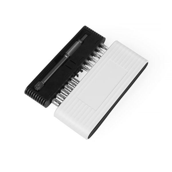 Набір з високоякісної сталі в компактній, пластиковій коробці, яка оригінально відкривається натиском на кнопку. В комплект входить 25 шт інструментів: