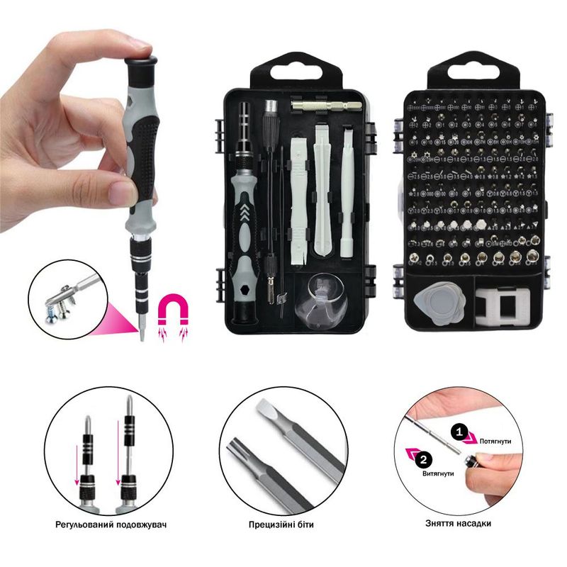 - 98 змінних біт для популярних типів шліців (прямі, хрестоподібні, трикутні, квадратні, зірки, шестигранники, торцеві, форма U та Y)