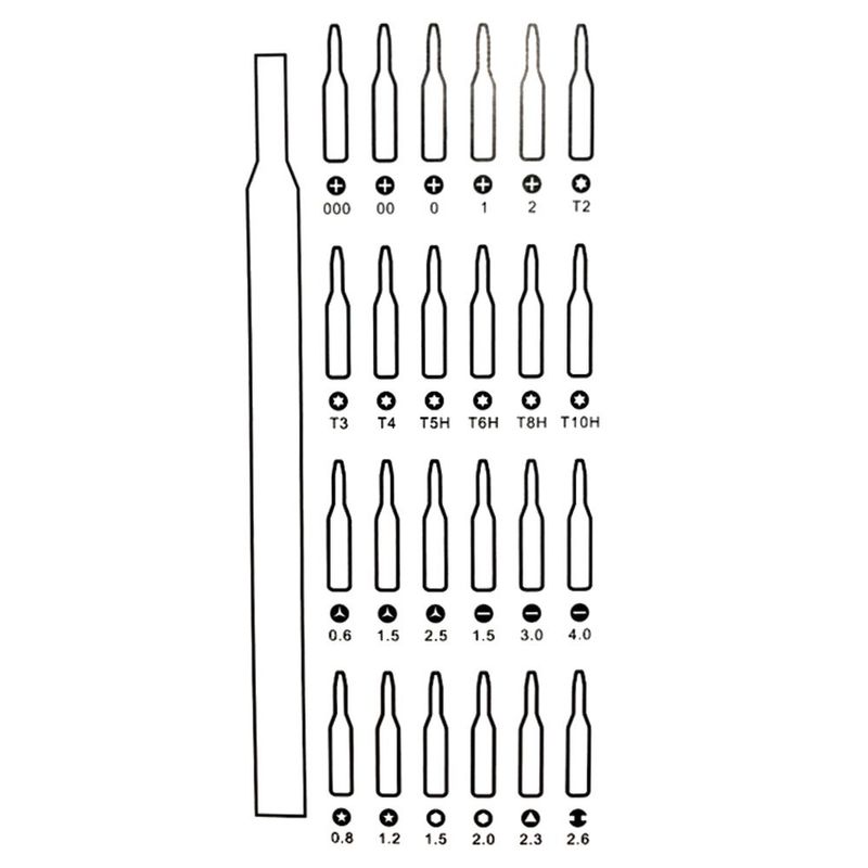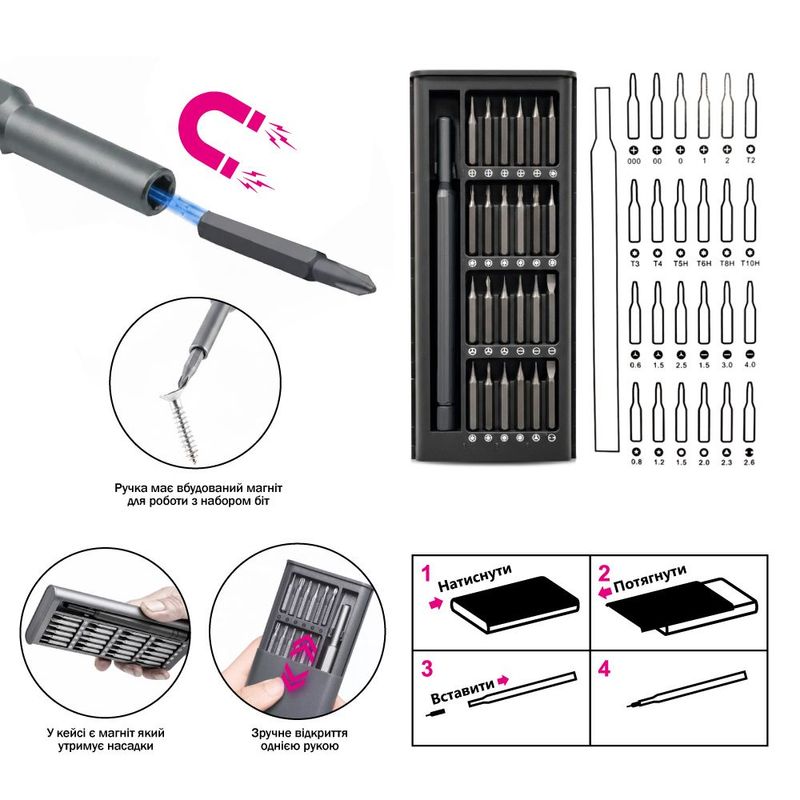 - 24 змінні біти для популярних типів шліців (прямі, хрестові, трикутні, квадратні, зірки, шестигранники, торцеві, форма U та Y)