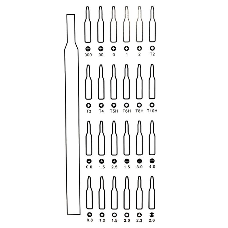 - 24 змінні біти для популярних типів шліців (прямі, хрестові, трикутні, квадратні, зірки, шестигранники, торцеві, форма U та Y)