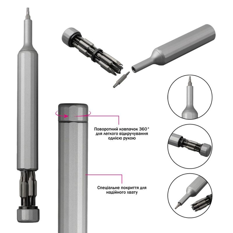 - Рукоятка з внутрішнім сховищем для біт, антиковзким покриттям і магнітом