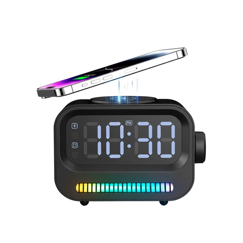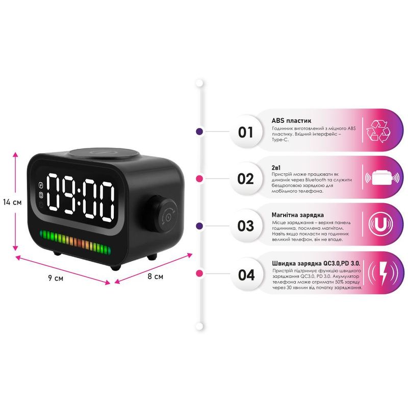 RapidFlow — практичний портативний пристрій 3 в 1: колонка, годинник з будильником і бездротова зарядка для смартфонів. Ідеальний вибір для дому, офісу або подорожей.