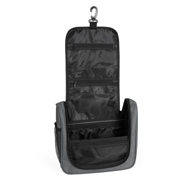 Компактна косметичка з ручкою та карабіном, велике відділення на блискавці, має внутрішні розділювачі-фіксатори на резинці, різні кишені з сітки, тканини, та щільного прозорого поліетилену на блискавці. Зовнішня кишеня на блискавці та бокова кишеня із сітки. Тканина: поліестер 600Х300D/PVC. Розмір: 26 х 34 х 10 см. Метод нанесення: шовкодрук, тремотрансфер.