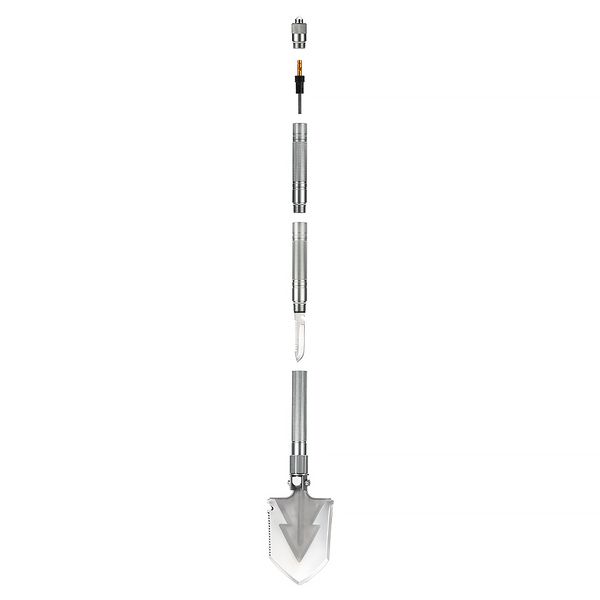 Багатофункціональна лопата для застосування у туризмі. Включає 15 функцій, у тому числі ніж, свисток, викрутка, склобій. Виготовлена з міцних та зносостійких матеріалів, нержавіюча сталь 20cr13 і високоміцний алюміній 6061-T6,зручної конструкції, легко упаковувати, зберігати та переносити. Витримує значні механічні навантаження. Довжина лопати складає 1 метр. Робочу лопать можна зафіксувати під різними кутами, таким чином лопата може виконувати функції: o лопати (при куті нахилу робочої лопаті 180°) o сапки (при куті нахилу робочої лопаті 85°) o гака (при куті нахилу робочої лопаті 30°)