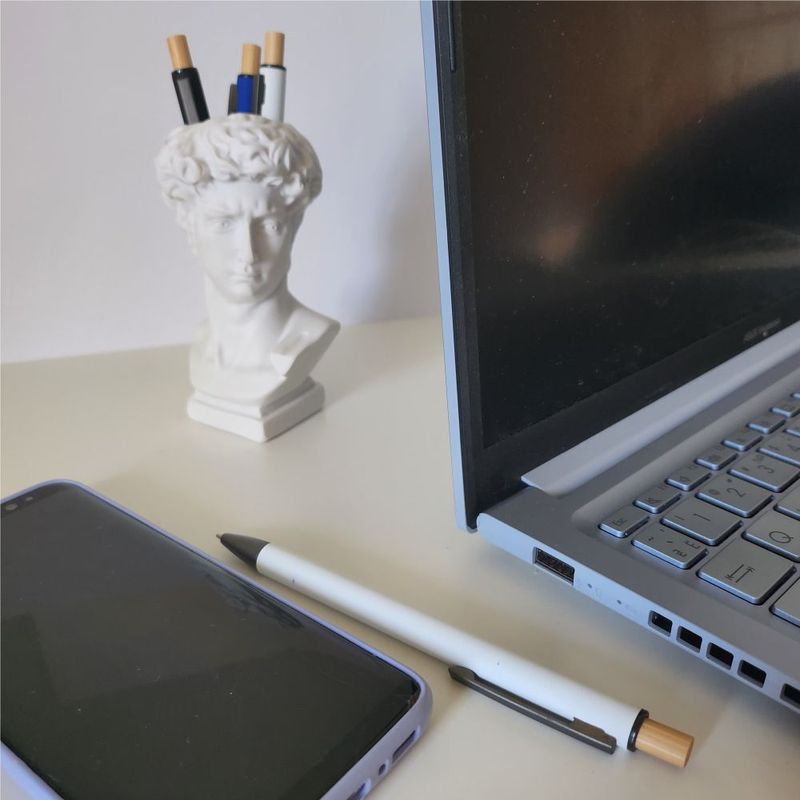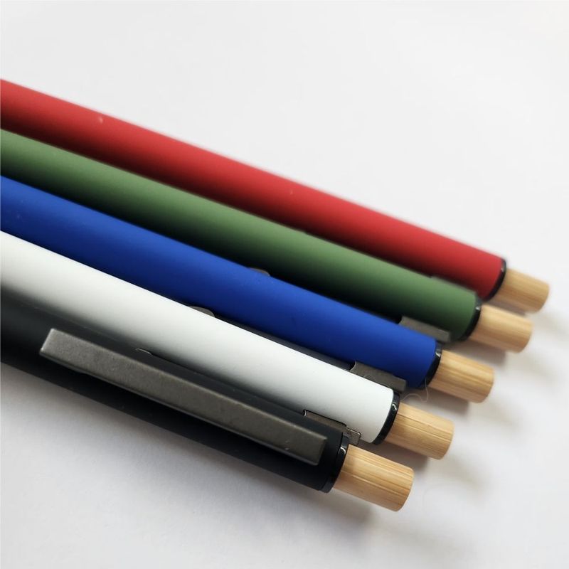 Корпус ручки виготовлений з алюмінію, зверху нанесене кольорове покриття Soft touch. Виріб має бамбукову кнопку.