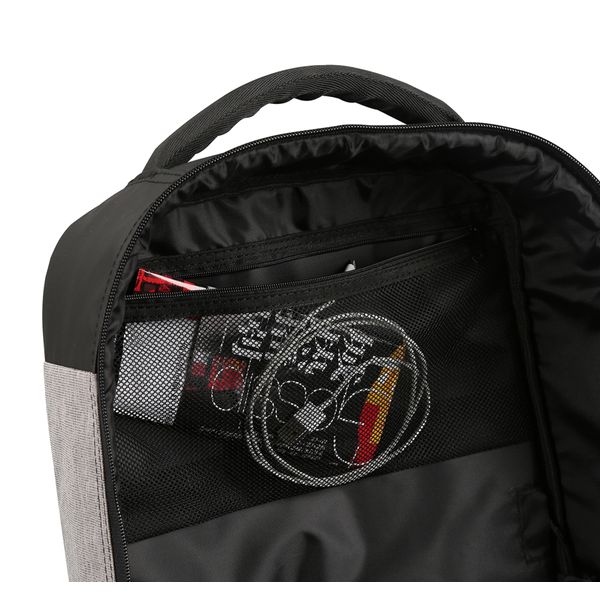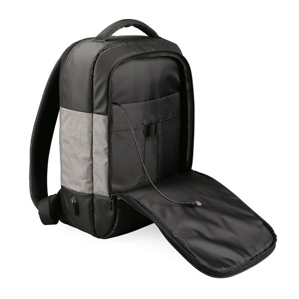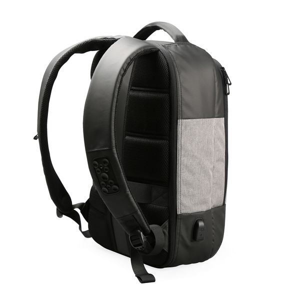Рюкзак антизлодій для ноутбука 15,6” та планшету .Тканина водонепроникний 100% поліестер фібра + поліуретан, має USB Port, основний великий вітділ та різні кармани органайзери, дві бокові кишені, ремінь для валізи. Розмір 45Х30Х14. Нанесення шовкодрук, термоперенос .