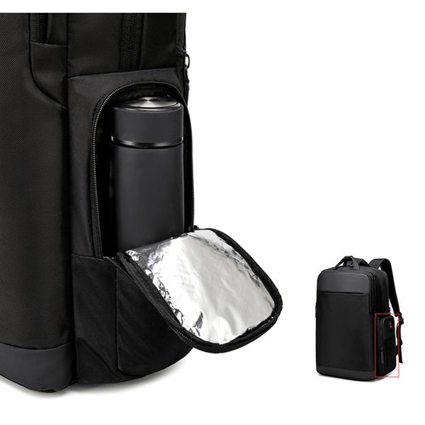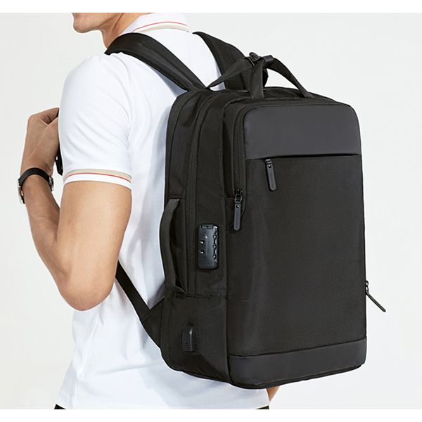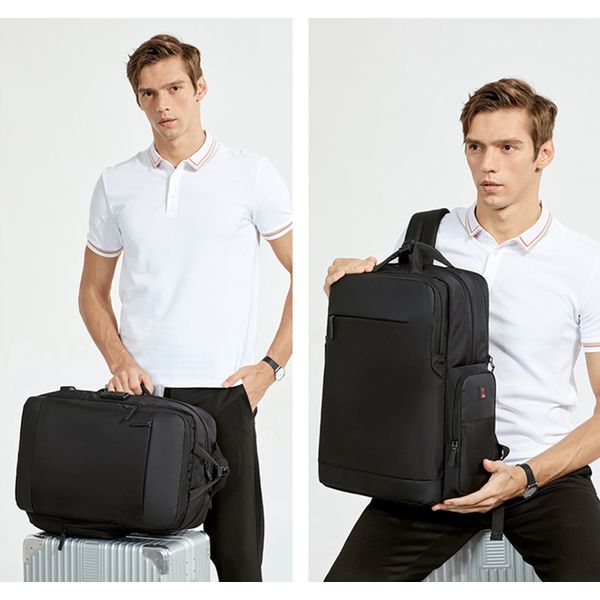 Рюкзак з відділенням для ноутбука 15,6” та відділенням для ipad . Тканина водонепроникний 100% поліестер + PU, має USB Port, захистний кодовий замок, великий відділ з еластичними ремінями для одягу та різні кармани-органайзери, прихована кишеня на лямці для карток, бокова термо-кишеня для пляшки, на задній спинці ремінь для валізи. Також рюкзак має крім вертикальної ручки горизонтальну і може трансформуватися в сумку, при цьому задні лямки ховаються в приховане відділленя. Рюкзак можливо збільшити в обьемі за рахунок складеного відділення.