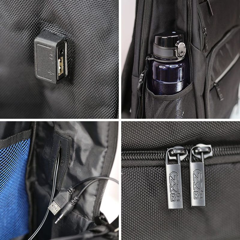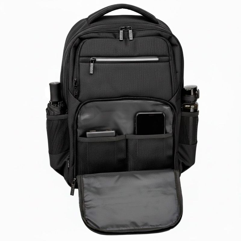 Рюкзак має два великі відділення з органайзером і м’якою кишенею для ноутбука, а також чотири фронтальні кишені на блискавках і дві бічні кишені для пляшок чи парасолі. Передбачене гніздо для навушників. Зовнішні кишені меншого розміру обладнані контрастними блискавками.