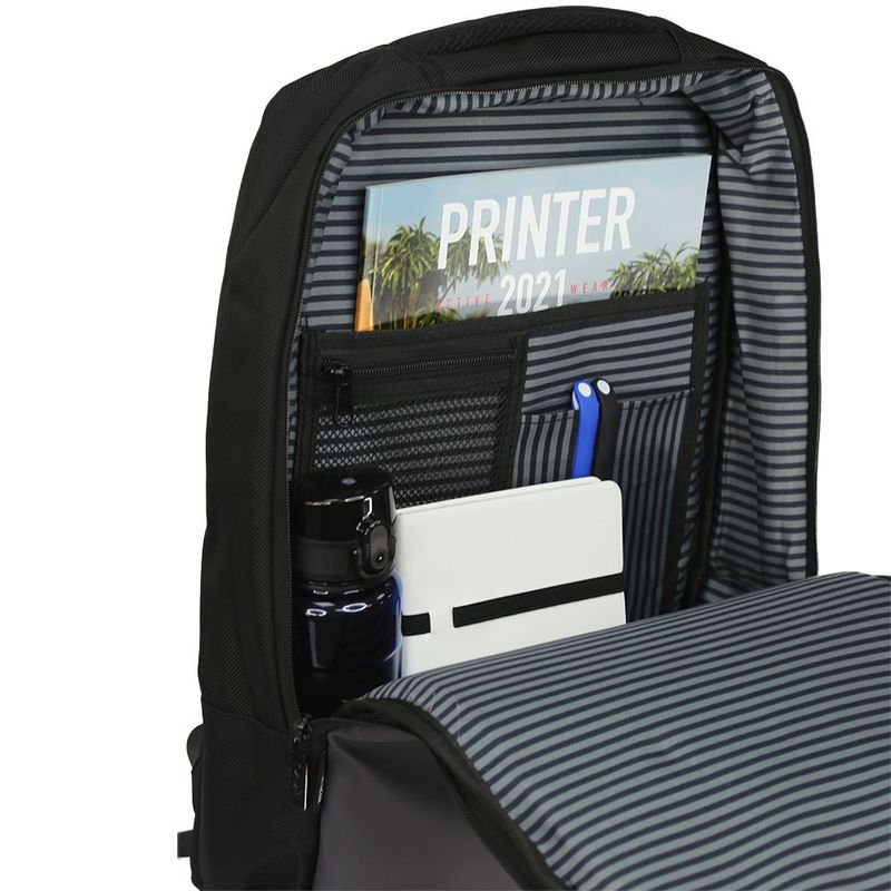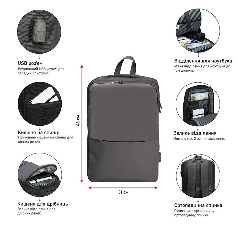 Модель має два великі відділення, фронтальну кишеню та приховану кишеню на спинці. Всередині є органайзери для аксесуарів і м’яке відділення для ноутбука. Завдяки ергономічним лямкам і посиленій спинці рюкзак зручний навіть під час тривалого носіння.