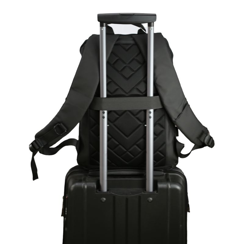 - Для фіксації виробу на ручці валізи на спинці рюкзака є еластичний ремінь. Рюкзак обладнаний міцною ручкою для перенесення.