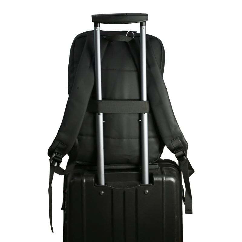 - Для фіксації виробу на ручці валізи на спинці рюкзака є еластичний ремінь. Рюкзак обладнаний міцною ручкою для перенесення.