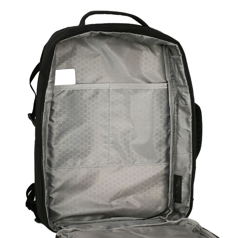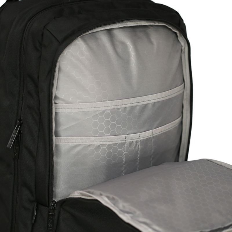 Рюкзак має продуману конструкцію з трьома відділеннями на блискавці. Найменше — переднє — оснащене внутрішніми кишенями для ручок, карток та гаманця. Середнє, найбільше, відкривається як валіза та також має внутрішні кишені. Третє відділення обладнане м’якими кишенями для ноутбука й планшета. На спинці є потаємна кишеня з блискавкою.