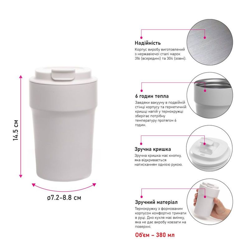 Об’єм кружки – 380 мл. Зручна кришка має кнопку, яка відкривається натисканням однією рукою.