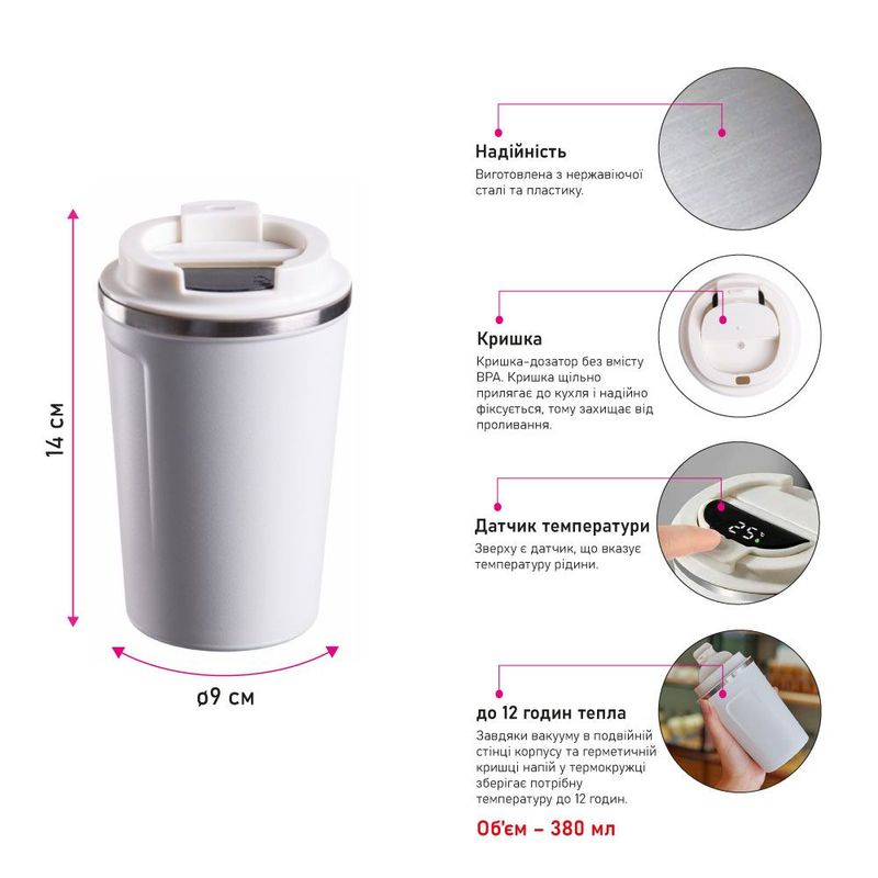 Об'єм кухля — 380 мл. Завдяки вакууму в подвійній стінці корпусу та герметичній кришці напій у термокружці зберігає потрібну температуру до 12 годин. Корпус виробу виготовлений з нержавіючої сталі марок 304 (всередині) та 201 (зовні).